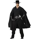 - This Zorro costume includes shirt, satin cape, studded belt, studded gloves, hat, mask and sword.